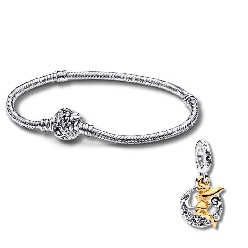 Потопи се в магията на приказния свят с нашия Тинкърбел Дуо Сет, включващ елегантна сребърна гривна и приказен талисман с Тинкърбел. ✨ Феята е изработена с детайлно позлатяване, носеща усещане за нежност и чудеса. Луната и звездите допълват мечтания дизайн за всеки, който вярва в магията.