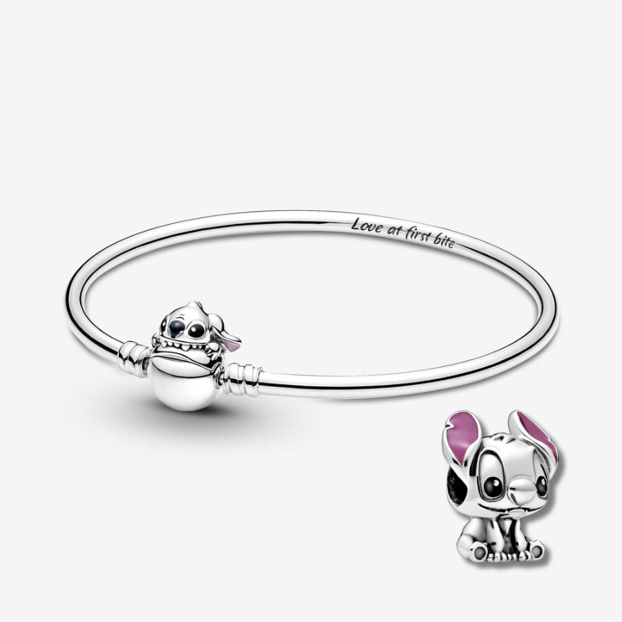 Стич Дуо Сет – Сребърна гривна с гравюра „Love at first bite“ и очарователен талисман Стич с розови ушички. Идеален за почитатели на Стич и всички, които вярват в силата на малката вселена, наречена „Охана“.
