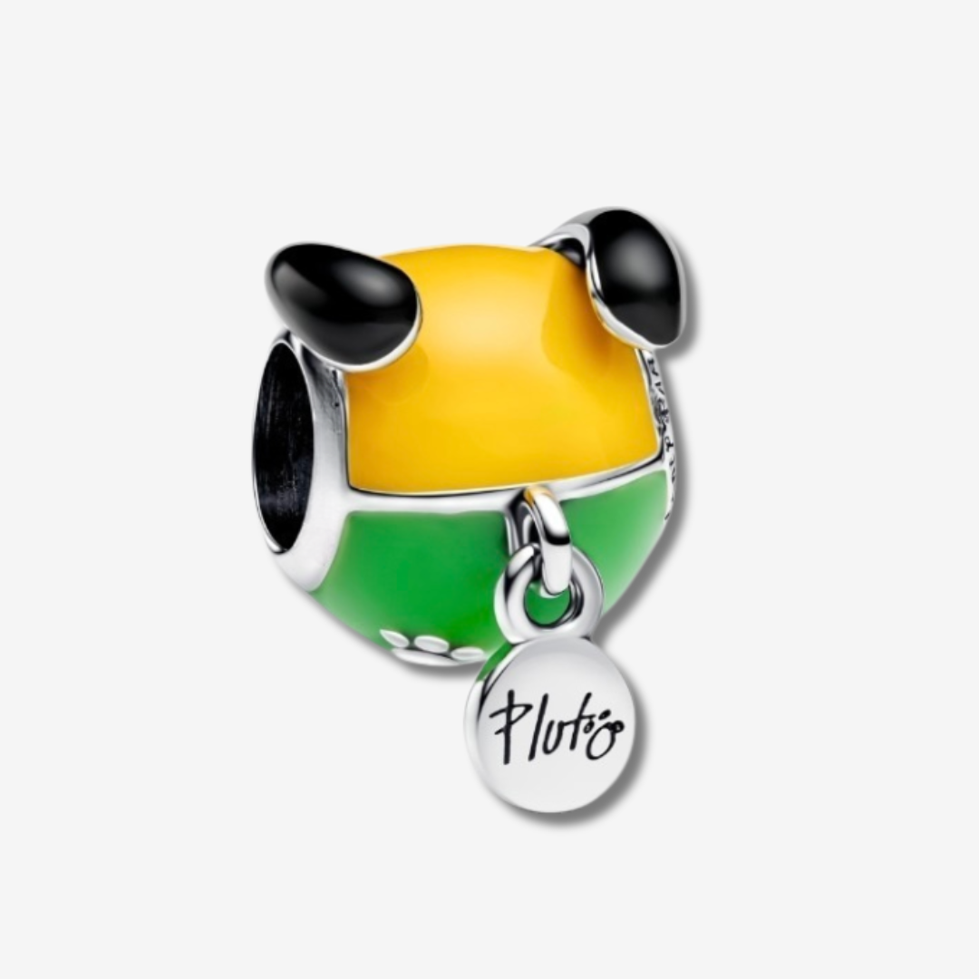 Изработен от сребро проба 925 и ръчно изрисуван с жълт и зелен емайл, този талисман пресъздава веселото кученце на Мики Маус по закачлив и стилен начин. Детайлите включват черни ушички и висяща кръгла табелка с надпис „Pluto“, което придава още повече автентичност и чар.