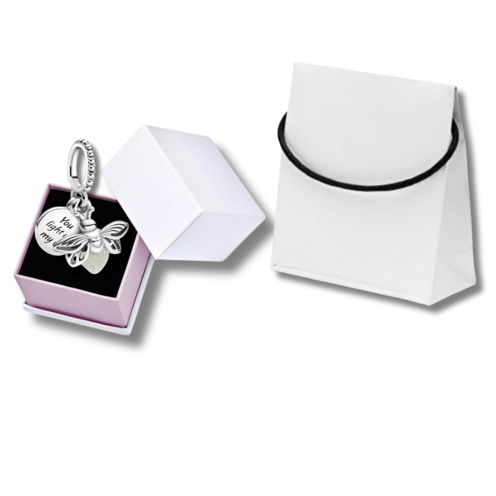 ✨ Нежен сребърен сет с талисман „Светулка“, който свети в тъмното, поднесен в елегантна подаръчна кутийка и торбичка с панделка - малък жест, който казва „Ти осветяваш живота ми“.