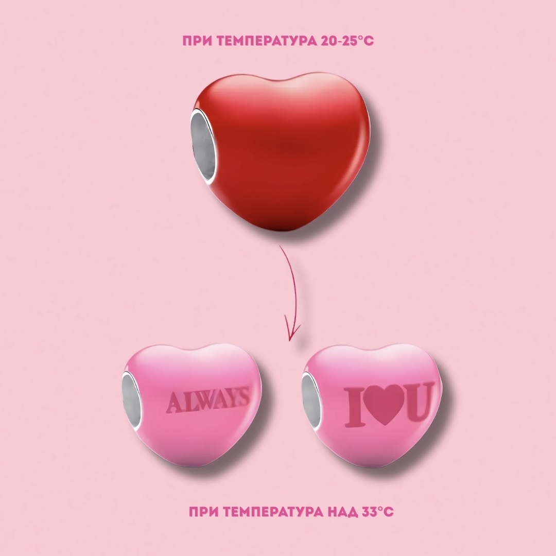 ✨ Сребърен талисман „Топло послание“ - сърце, което реагира на температурата, променяйки цвета си от червен към бледо розов. При затопляне се появяват нежните надписи „Обичам те“ и „Завинаги“ - символ на дълбока и истинска любов.