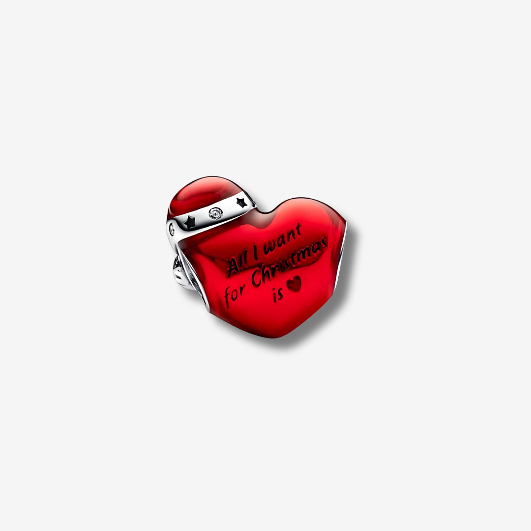 ? Сребърен талисман „Коледна мечта“ - сърце в празнично червено с миниатюрна шапка на Дядо Коледа и гравирано послание „All I want for Christmas is ❤️“. Символ на любовта и споделения празник. ?