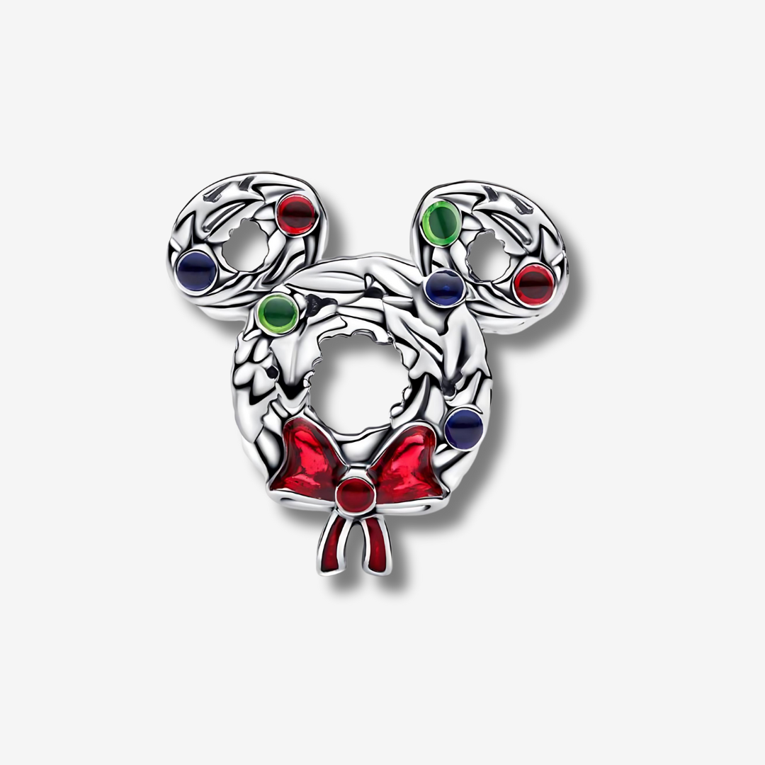 ?Сребърен талисман "Коледен Мики Маус венец"✨ - оформен като венец, декориран с емайлирани топчета в зелено и червено, както и червена панделка, която добавя празничен акцент.