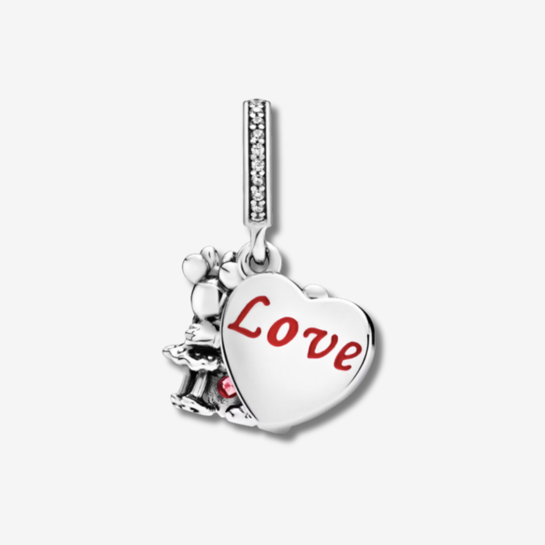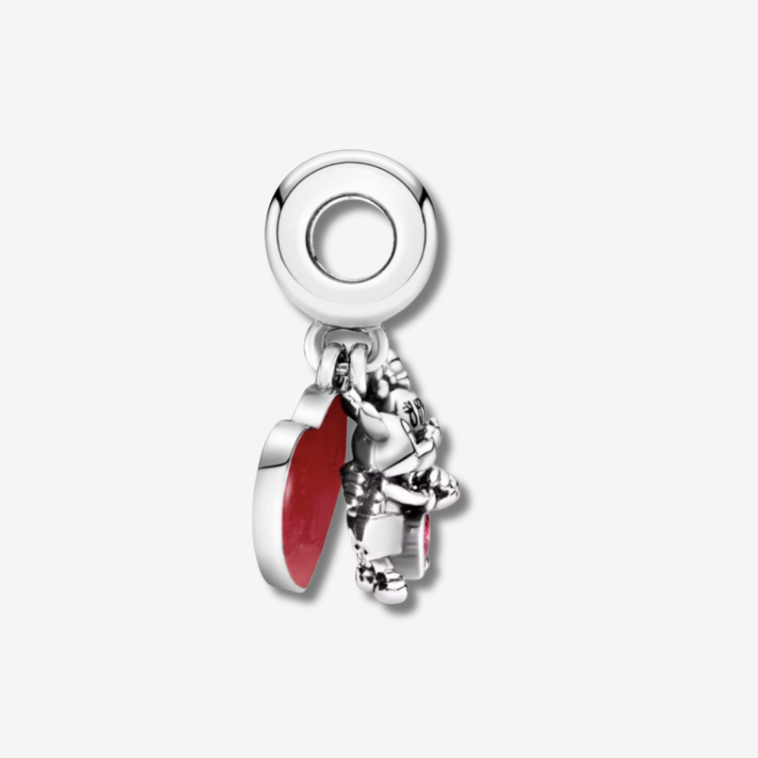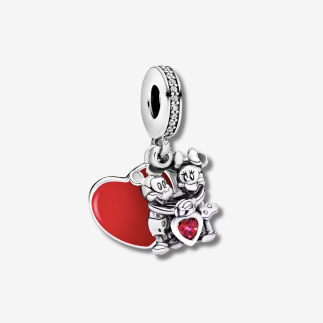 ✨ Сребърен талисман „Мики и Мини - Вечно заедно“ е очарователен символ на истинска обич. С яркочервено емайлирано сърце и блестящ камък във формата на сърце, този талисман носи топлина, романтика и неподправена магия. ❤️🐭
