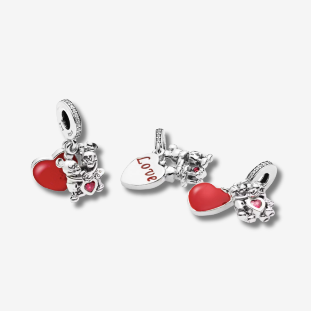❤️ Зад тях сияе голямо червено емайлирано сърце, което придава наситен цвят и романтично излъчване. Всеки детайл - от фино гравираните линии до малките искрящи камъни - прави талисмана уникален и забележителен.
