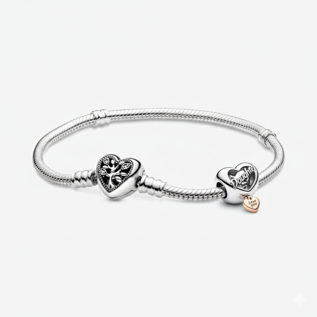 🌳 Сребърната гривна „Дървото на живота“ символизира корените, закрилата и непрекъснатото израстване, а сърцевидният талисман „Дъщеря“ носи послание за нежност, грижа и вечна свързаност.