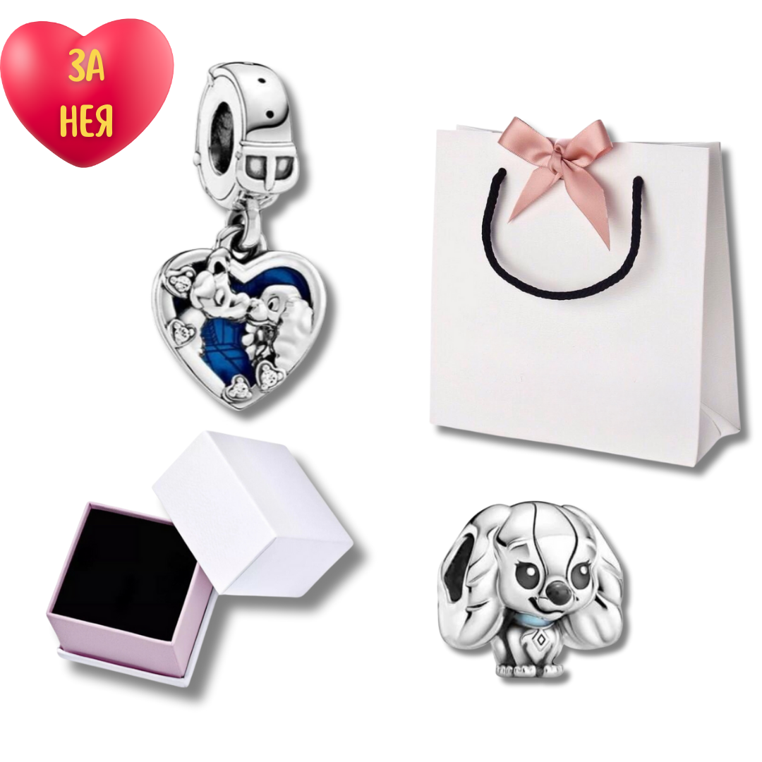 Романтичен подаръчен сет с два сребърни талисмана „Лейди и Скитника“, с кутийка и торбичка - символ на истинска любов и споделени моменти.
