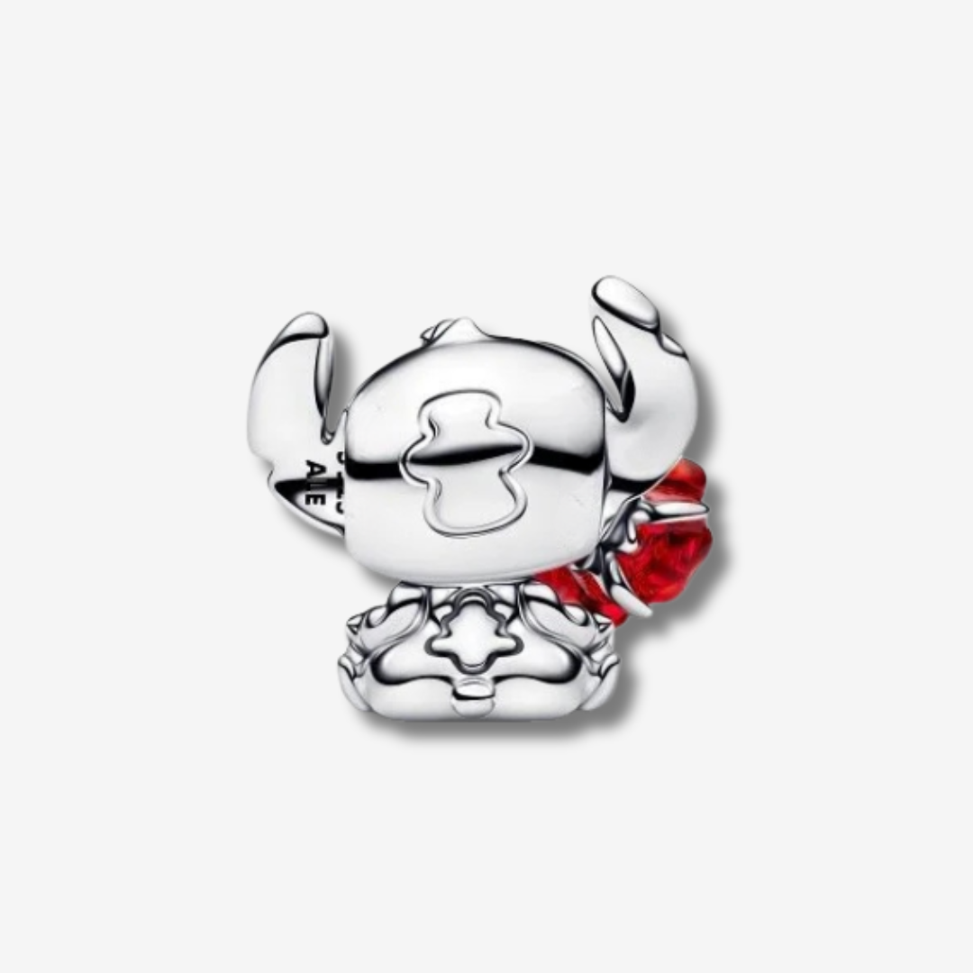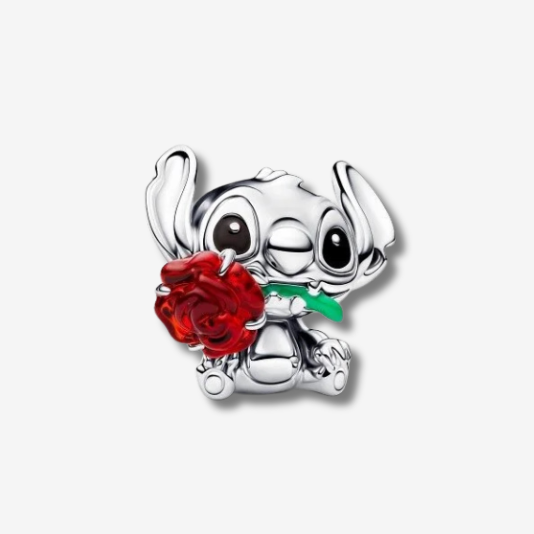 ✨ Сребърен талисман „Романтичен Стич" - Очарователен сребърен талисман, изобразяващ любимия герой в романтична визия с роза. Перфектен любовен подарък.