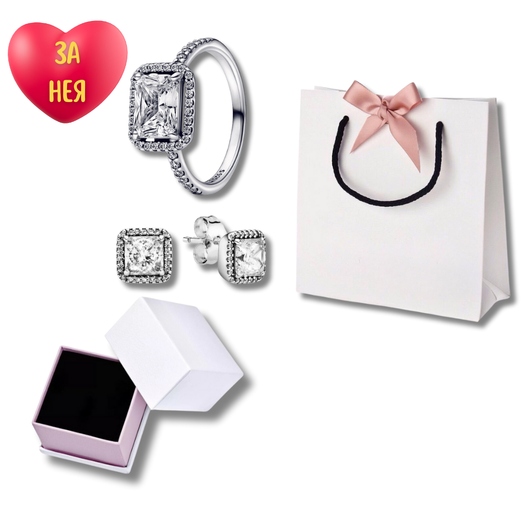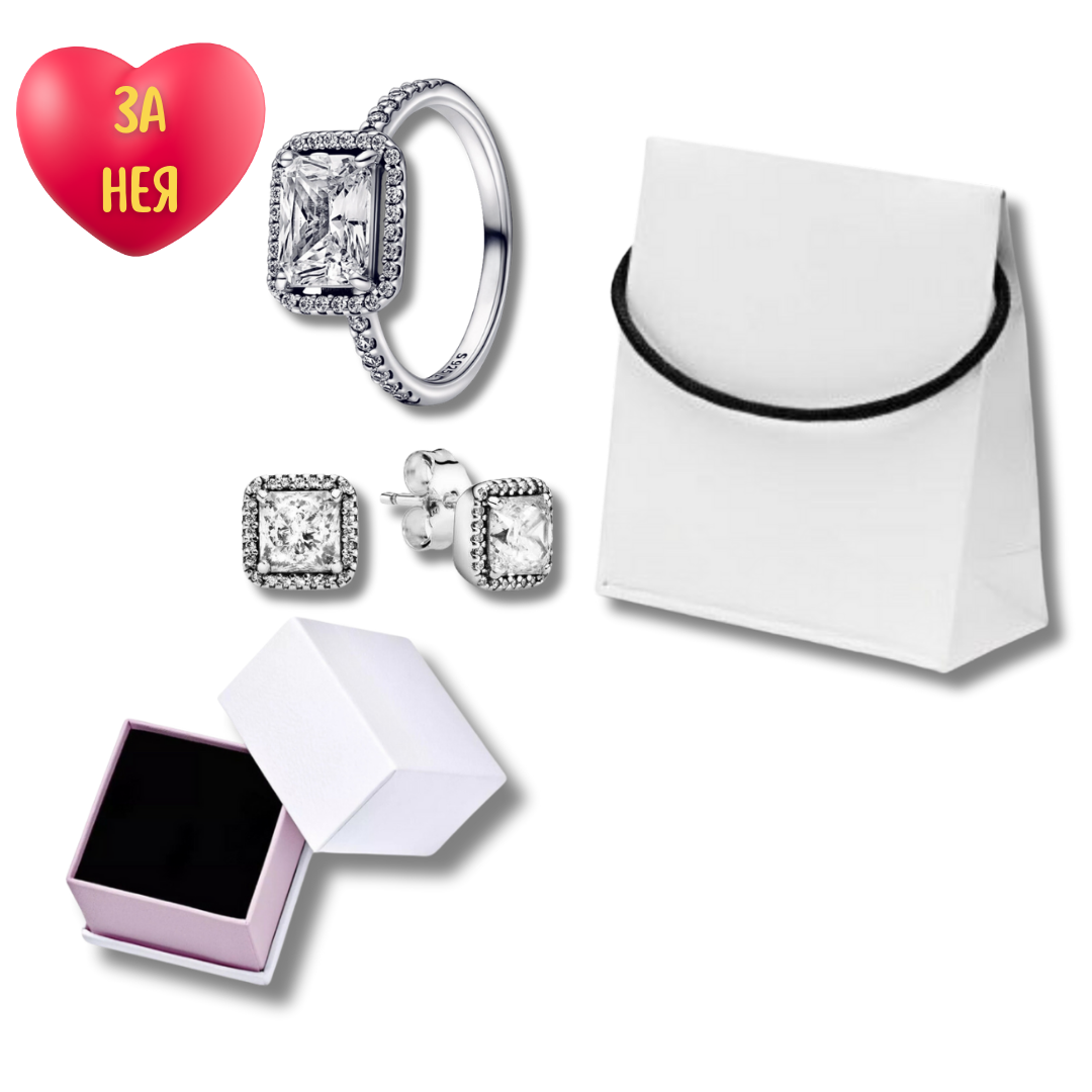 💎 Луксозен сребърен сет „Диамора“, включващ пръстен с централен блестящ камък и обеци „Принцеса“. Перфектният подарък за нея - в елегантна кутия и стилна подаръчна торбичка. ✨