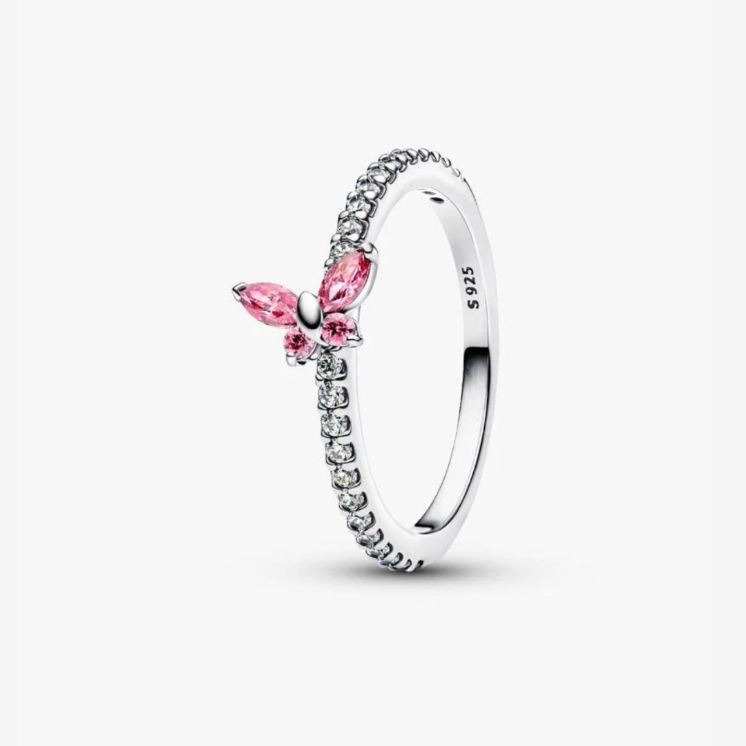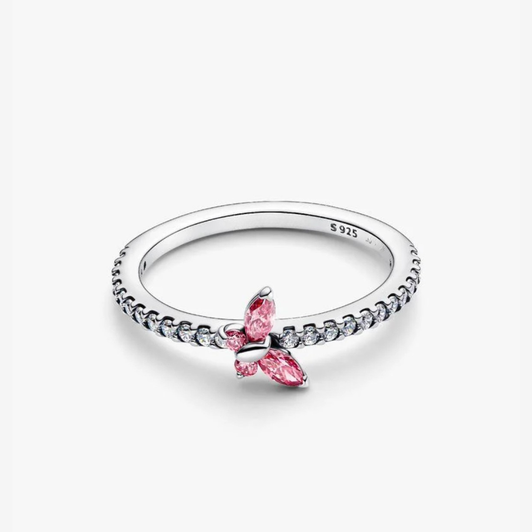 💕 Нежен сребърен пръстен „Розова пеперудка“ с блестящи розови камъни и фини цирконии по халката. Романтичен акцент, изпълнен с нежност и женственост.