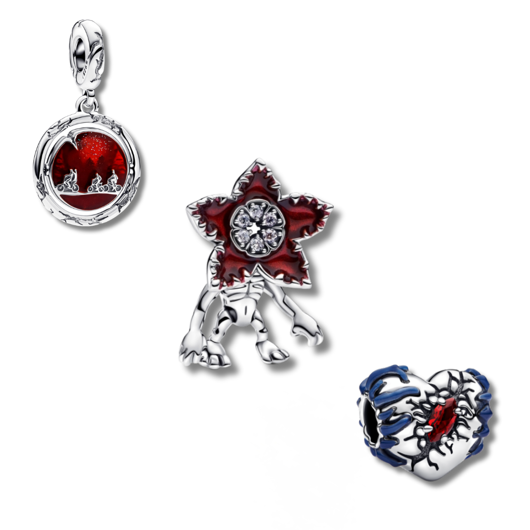 Тематичен сребърен сет „Странни неща“, вдъхновен от мистериозния свят на Хоукинс. Комплектът включва три сребърни талисмани от сериала - перфектен избор за фенове на напрежението и свръхестественото.