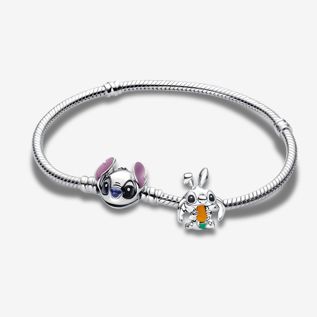 🐰 Очарователен сребърен талисман „Стич зайче“, изобразяващ Стич в сладък заешки костюм с цветни детайли. Перфектен акцент за всяка гривна и чудесен подарък. ✨